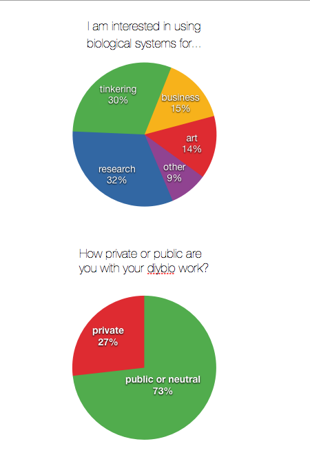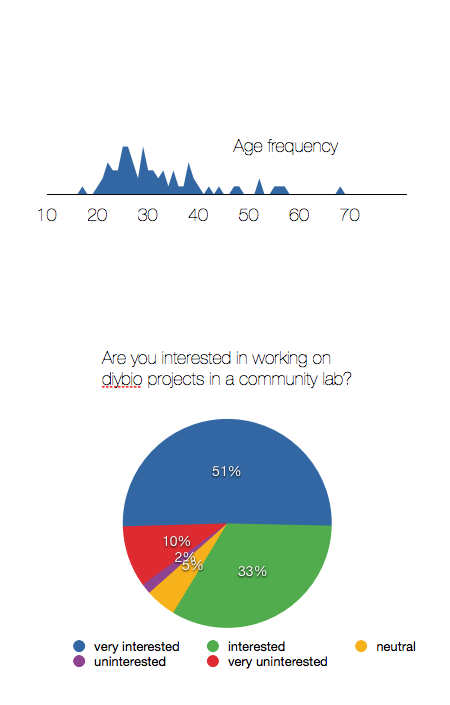 From April 20th to May 7th we ran a survey. We asked respondants about basic demographics, the future of diybio.org, perceptions about safety and regulation, and more.